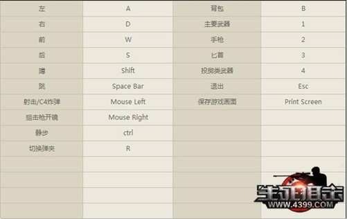 1785相信大家对射击类的游戏都不陌生,在这里玩家们可以体验到枪林弹雨的激情,让你在这里体验到战争的快感。那么,你对游戏的操作熟悉吗?下面不妨和小编一起看看生死狙击的基本操作吧。基本操作 左 A 背包 B右 D 主要武器 1前 W 手枪 2后 S 匕首蹲 Shift 投掷类武器 4跳 Space Bar 退出 Esc射击/C4炸弹 Mouse Left保存游戏画面 Print Screen狙击枪开镜 Mouse Right切换弹夹 R游戏简介 4399生死狙击是一款无插件真3D第一人称射击(FPS)网页游戏,爽快打击和华丽视效的枪战风格,打开网页,即可感受枪林弹雨的枪战乐趣。多种对战模式,实现客户端FPS游戏常规玩法无端化,让你随时随地与好兄弟战个痛快。