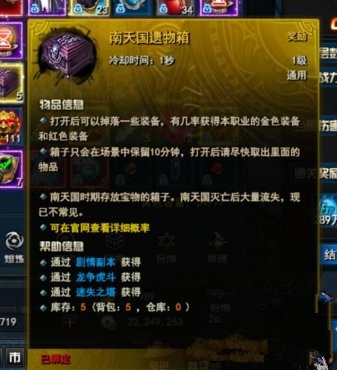 926剑灵洪门崛起中的南天国遗物箱相信大家都不陌生,每开启箱子都有你意向不到的惊喜。那么,你想知道知道开启箱子的技巧吗?下面就随小编一起来看看吧。获取南天国遗物箱方法: 1、通过剧情副本获得(每日扫荡剧情副本可以拿到很多箱子)2、龙争虎斗获取3、迷失之塔获取 打开包裹——找到南天国遗物箱——右击南天国遗物箱就可以看到界面一地的银币、装备、元宝,开启自动挂机拾取,那是一地的羡慕。想要开南天国遗物箱开得特别爽就存着很多不开,然后一次性开光,当然你也需要包裹内有足够多的空格,包裹满了的话就会关闭自动开箱功能,这时候你可以把装备进行熔炼了再继续。想要土豪感就来剑灵洪门崛起,刷开南天国遗物箱吧。