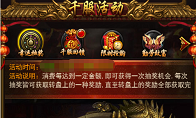0千服活动一、 幸运抽奖消费每达到一定金额,即可获得一次抽奖机会,每次抽奖皆可获得转盘上的一种奖励,直到转盘上的奖励全部获取完毕。第一个转盘道具对应元宝(不可对外告知玩家)消费10000元宝:战纹(特)*20消费20000元宝:生肖袋*3消费30000元宝:精炼石*128消费50000元宝:红色战纹*1消费100000元宝:元神丹(大)*3消费200000元宝:10转装备箱*1消费300000元宝:九转衣服盒*1消费500000元宝:九转武器盒*1消费750000元宝:龍之甲*1消费1000000元宝:龍之斩*1第二个转盘道具对应元宝(不可对外告知玩家)消费1250000元宝:凤舞九天*1消费1500000元宝:龙行天下*1消费1750000元宝:12转装备箱*1消费2000000元宝:龍之甲*1消费225000